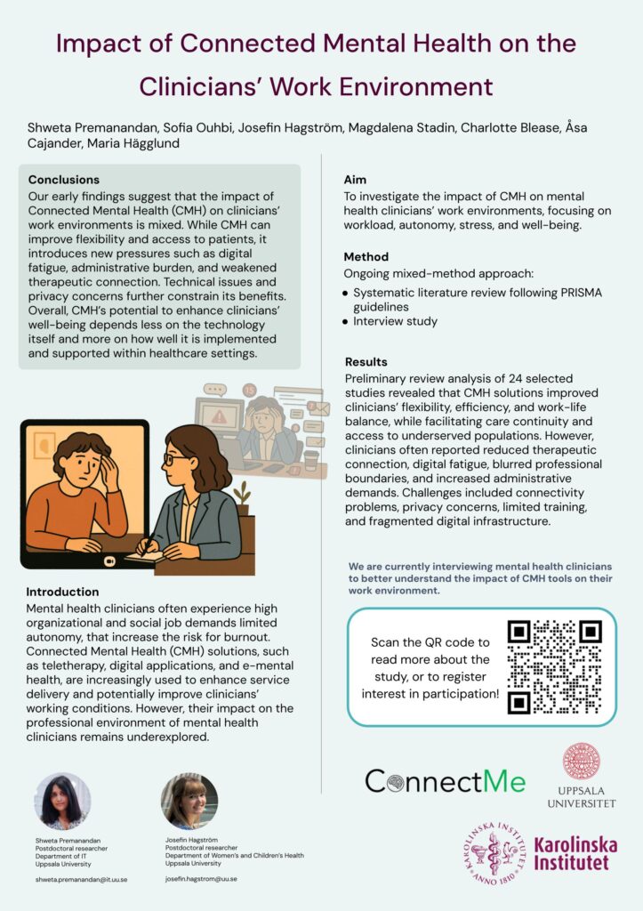 The SCCP conference is organized by Karolinska Institutet and focuses on research on various aspects related to psychological treatment. We submitted a poster describing the ConnectMe project, relating our work of exploring the impact of connected mental health tools on clinicians’ work environments. This conference seemed like a great forum to reach mental health clinicians to spread awareness about our project, as well as potentially recruit some participants to the ongoing interview study!